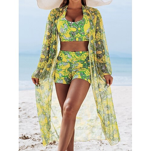 Frauen Bikini 3-teiliges Badeanzug Shorts Schlank Rückenfrei Urlaub Strandbekleidung Blumenmuster Halter Hals Ärmellose Badeanzüge