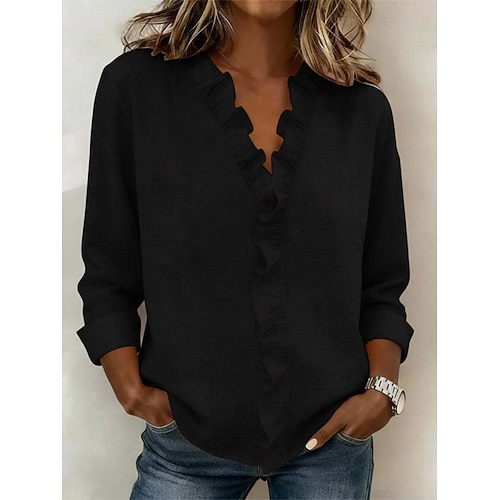 Blusa in lino simile cotone finto per donne volant patchwork colore solido elegante stilosa base maniche lunghe scollo a V tops regolari quotidiana nero bianco rosa primavera autunno