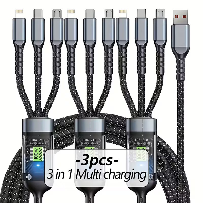 3-Pack Universal Fast Charging Cable, QC3.0 Nylon Braided Multi Charging Cord with Lightning, Micro USB and USB-C Connectors for Multiple Smartphones