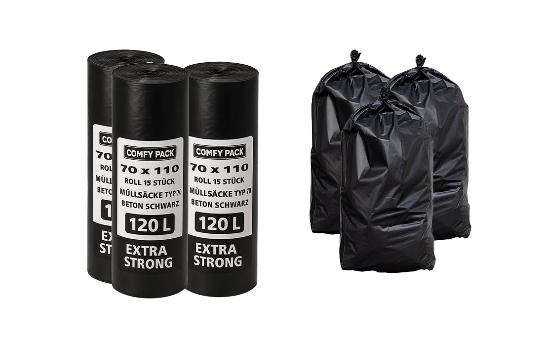 Lauroo 3 Rollen Müllsäcke Typ 70 – 70×110 cm – 120 Liter – Extra Strong – 3 Rollen à 15 Stück (45 Stück) – LDPE – Beton Schwarz – Reißfest & Durchstoßfest