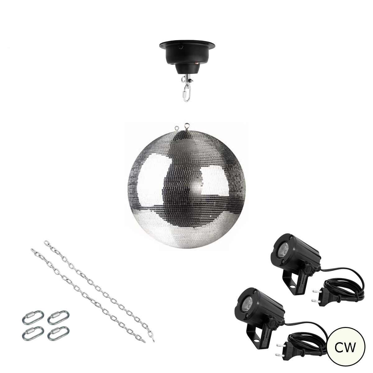 SATISFIRE Spiegelkugel Komplettset 30cm mit Motor, 2 x LED Pinspot (kaltweiss)