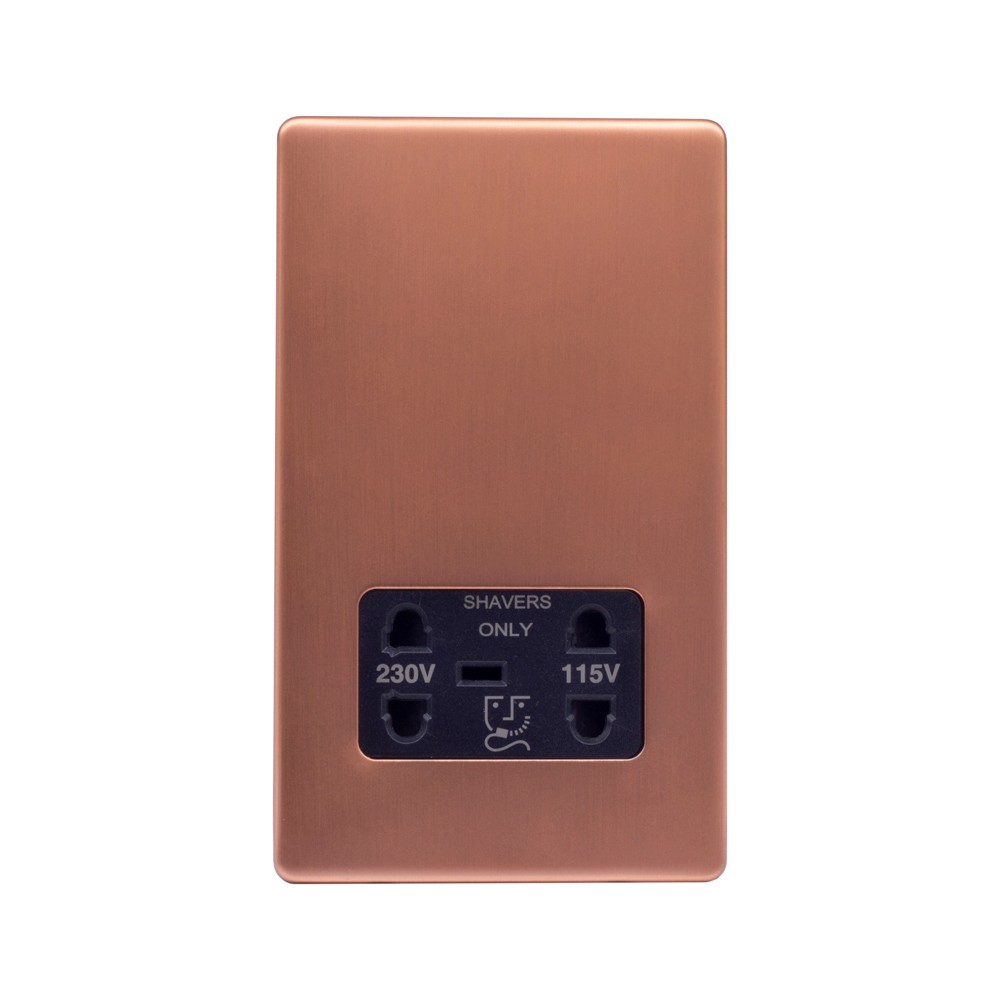 Lieber Brushed Copper Shaver Socket 230/115V Plate - Black Insert Screwless - Size: 146mm x 86mm x 4.7 mm