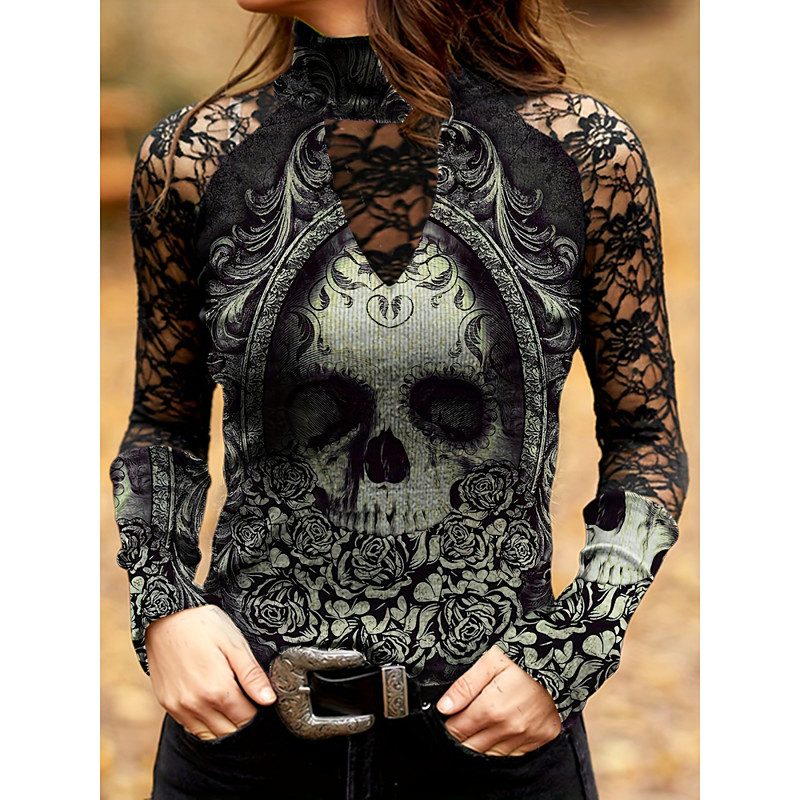 Women's Blouse Vintage Rock Hippie Long Sleeve High Neck Regular Tops Daily Print Black Green Spring Fall Winter