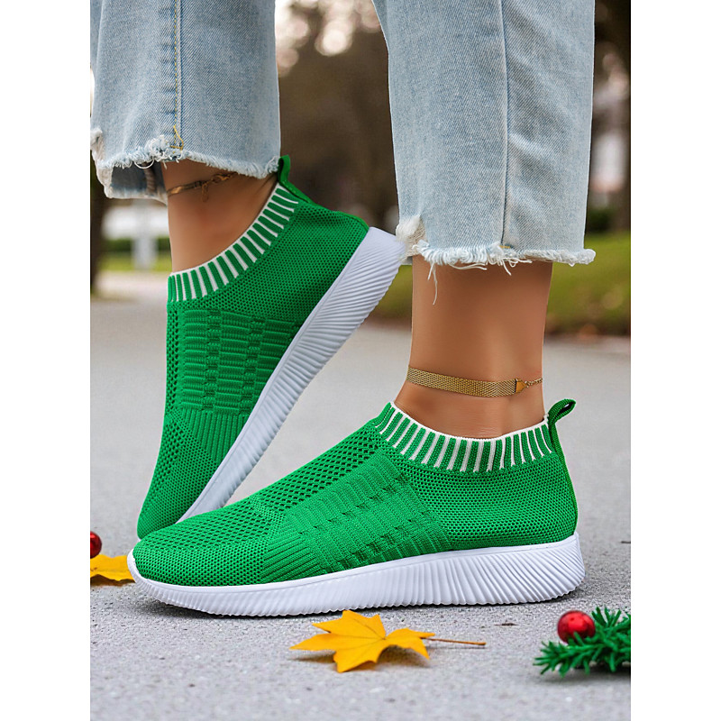 Women's Green Flyknit Slip-On Sneakers – Stretch Sock Fit, Breathable Lightweight Design, Perfect for Daily Walking, Travel, Christmas Street Style and Casual Winter Wear
