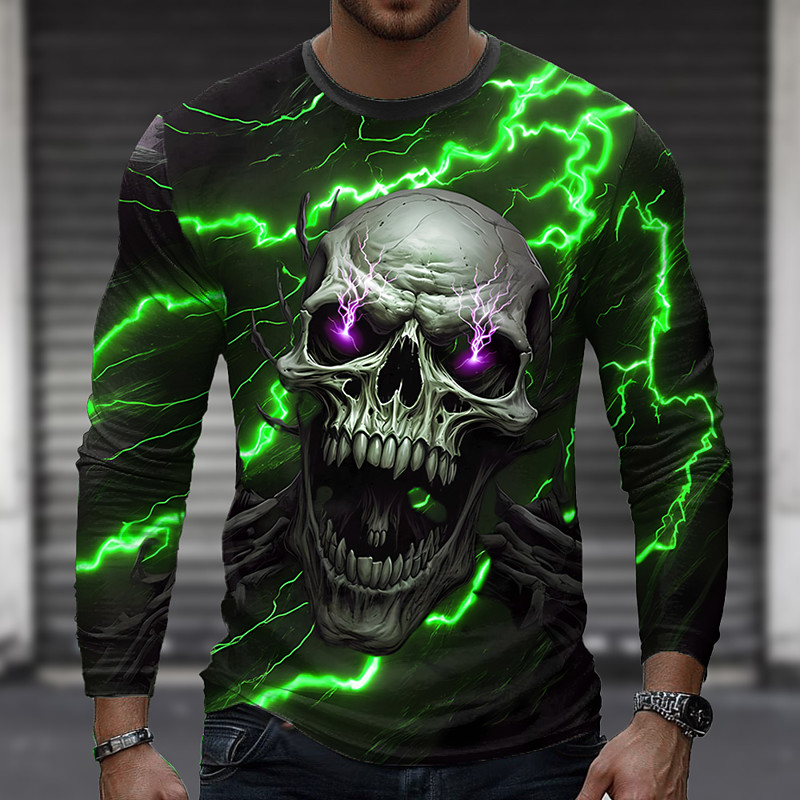 Men's Skull Lightning T Shirt Long Sleeve T shirt 3D Print Crew Neck Shirt Fashion Exaggerated Street Casual Daily Yellow Blue Green Summer Spring Fall Clothing Apparel S M L XL XXL XXXL