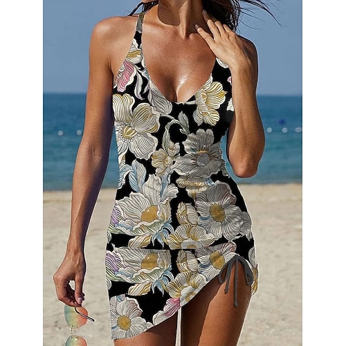 Damen Badeanzug Tankini Rock Bademode Elegant Urlaub Blumen Grafik V Ausschnitt Ärmellos Badeanzüge