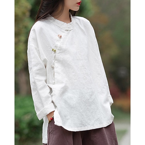 Per donna Camicie di cotone e lino Semplice Essenziale Moderno Manica 3/4 Colletto a Camicia Top Regolari Quotidiano Tasca Bottoni Bianco Giallo Rosa Azzurro cielo Estate Primavera Autunno