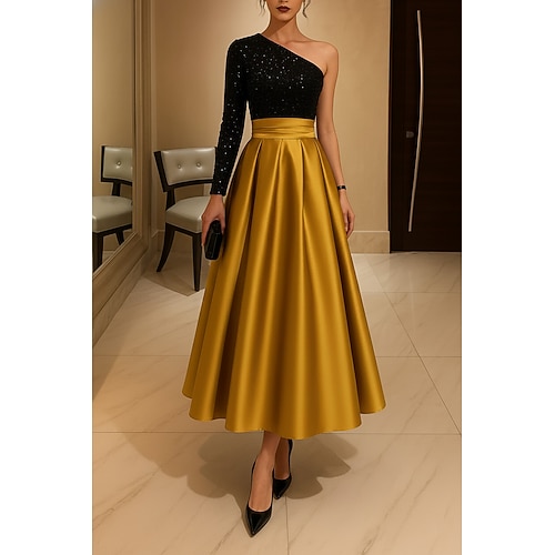 Linea ad A Lunghezza Tè Abiti da Cocktail Abiti da festa Elegante Manica Lunga Monospalla Festa in giardino Matrimonio Raso Con Paillettes con Pieghe Paillettes