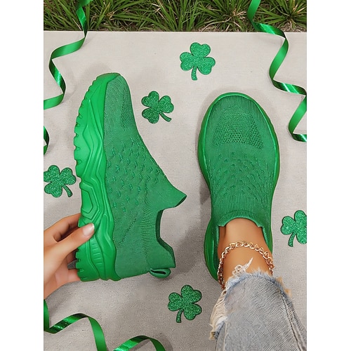 Sneakers slip-on verdi da donna con suola ammortizzata e vestibilità elasticizzata, comode scarpe Flyknit per il giorno di San Patrizio, adatte per abbigliamento casual, sfilate, festival, passeggiate e attività quotidiane