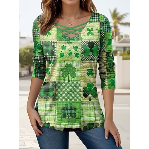 T-Shirt da donna di San Patrizio casual maniche lunghe V-collo tops regolari stampa quotidiana verde primavera autunno