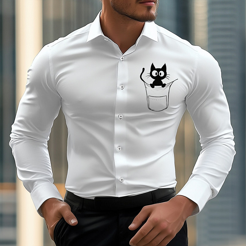 Men's Shirt Dress Shirt Cat Street Wear to work White Long Sleeve Turndown Spring Summer Clothing Apparel Print