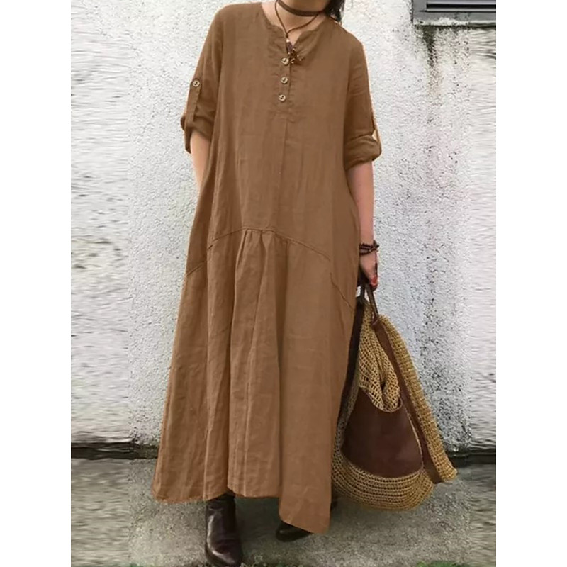 Women's ArmyGreen Navy Blue khaki Spring Fall Maxi Dress Linen-Inspired Dresses Elegant Fashion Office Loose Fit V Neck