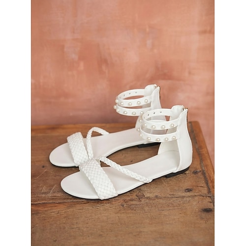 Weiße, geflochtene Damensandalen – elegante Perlen-Knöchelriemen-Sandalen für Luxuskreuzfahrten und tropische Inselurlaube Sommerurlaub am Meer