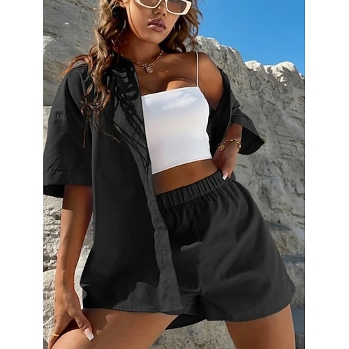 Per donna Set da due pezzi Camicia di cotone Set di Pantaloncini Manica Corta Colletto a Camicia Semplice Moda Streetwear Casuale Quotidiano All'aperto Nero Bianco Giallo Estate Vestibilità regolare