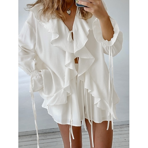 Per donna Camicia Set da due pezzi Set di Pantaloncini Manica Lunga Scollo a V Semplice Volant Moda Streetwear Casuale Quotidiano All'aperto Bianco Beige Estate Vestibilità regolare