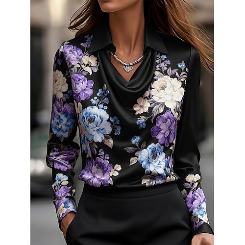 Per donna Camicia Floreale Grafico Elegante Casual Manica Lunga Scollo a Cascata Top Regolari Quotidiano Lavoro Ferie Stampato Drappeggiato Nero Bianco Viola Primavera Autunno