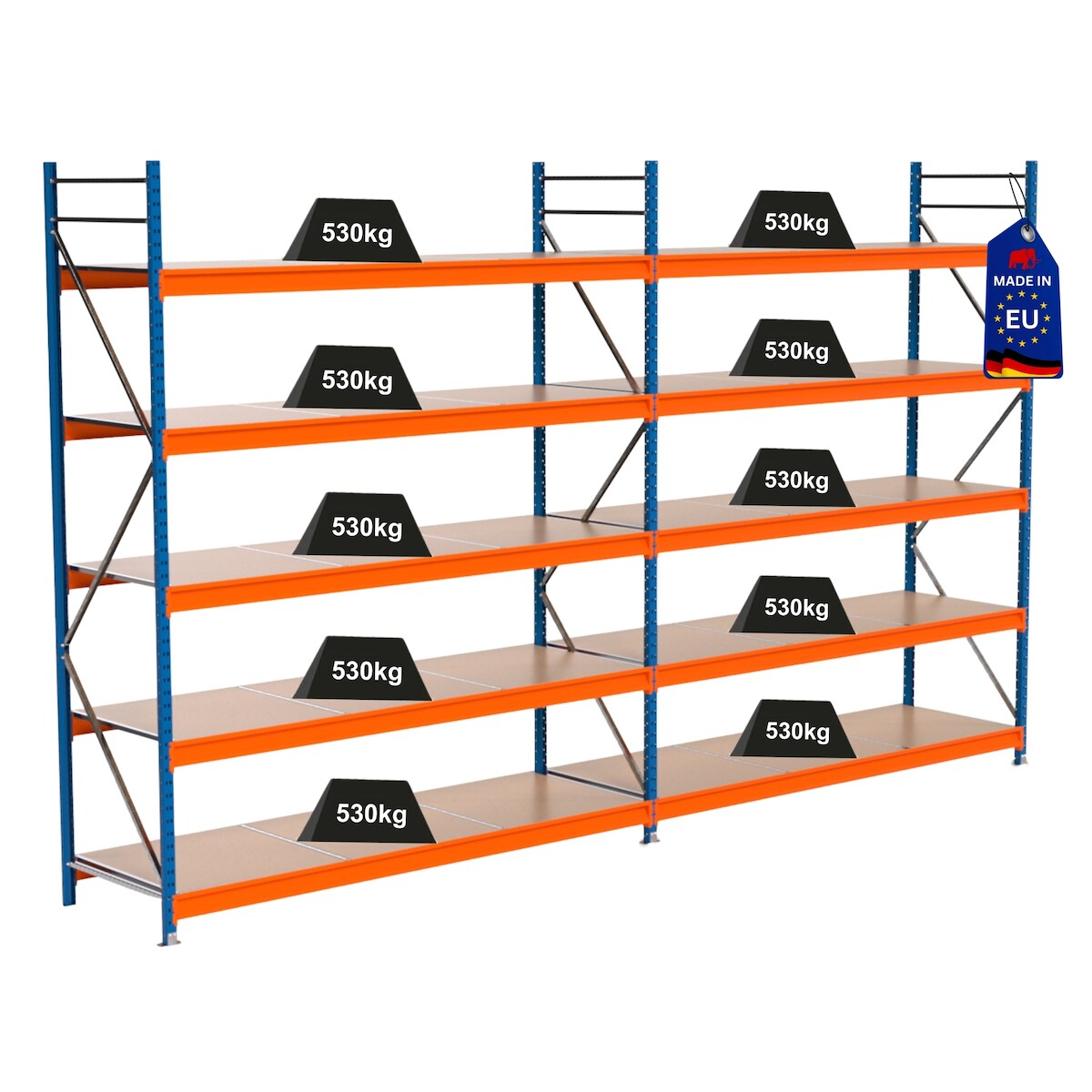 PROREGAL Industrie Schwerlastregal MAXIMUS PRO, Komplettregal, HxBxT 300x500x80cm, 5 Ebenen, Spanplatten-Fachboden, Fachlast 530 kg, Blau/Orange