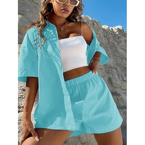 Per donna Set da due pezzi Camicia di cotone Set di Pantaloncini Manica Corta Colletto a Camicia Semplice Moda Streetwear Casuale Quotidiano All'aperto Nero Bianco Giallo Estate Vestibilità regolare