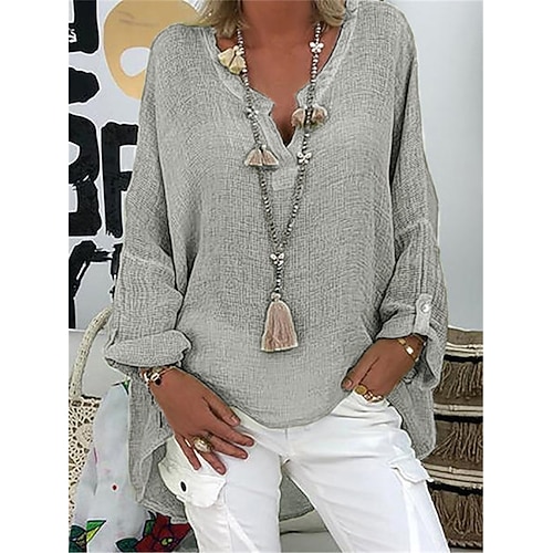 Per donna Camicia Blusa Camicie di cotone e lino Tinta unita Essenziale Manica Lunga Scollo a V Top lunghi Casuale Quotidiano Nero Bianco Rosa Verde militare Blu Estate Primavera