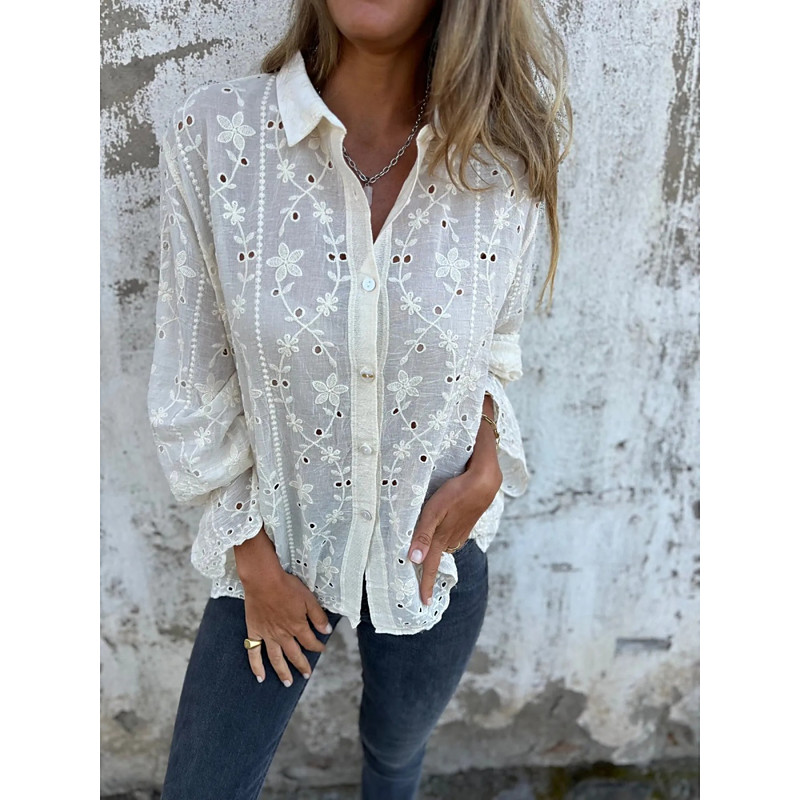 Women's Blouse Solid Color Stylish Casual Long Sleeve Shirt Collar Regular Tops Daily Eyelet White Apricot Summer Spring