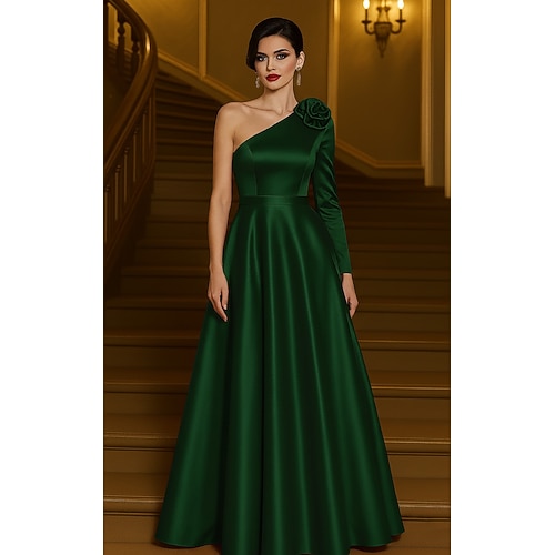 Abito da sera A-Line rosso in satin stretch elegante formale lungo fino al pavimento con maniche lunghe una spalla e fiore sulla spalla