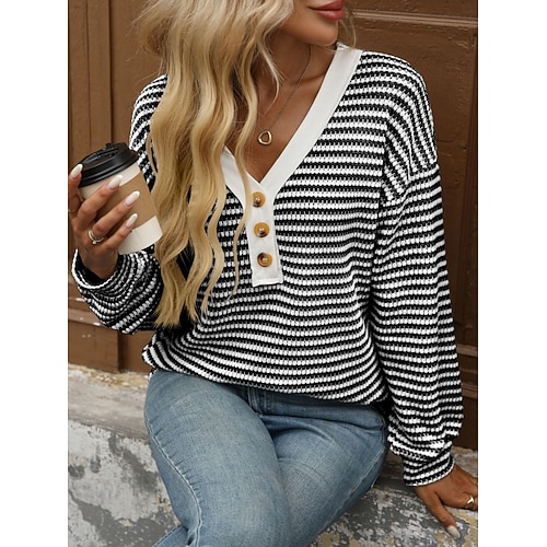 Per donna Maglietta A righe Elegante Moda Manica Lunga Scollo a V Top Regolari Quotidiano Weekend Patchwork Bottoni Stampato Nero Vino Azzurro cielo Marrone Beige Primavera Autunno