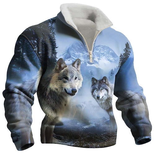 Per uomo Animale Lupo Pile Felpa Moda Casual 3D Collo alla coreana Zip a un quarto All'aperto Vacanza Regalo Abbigliamento casual alla moda Blu Blu 1 Blu 3# Blu 2# Mezza cerniera Autunno Inverno