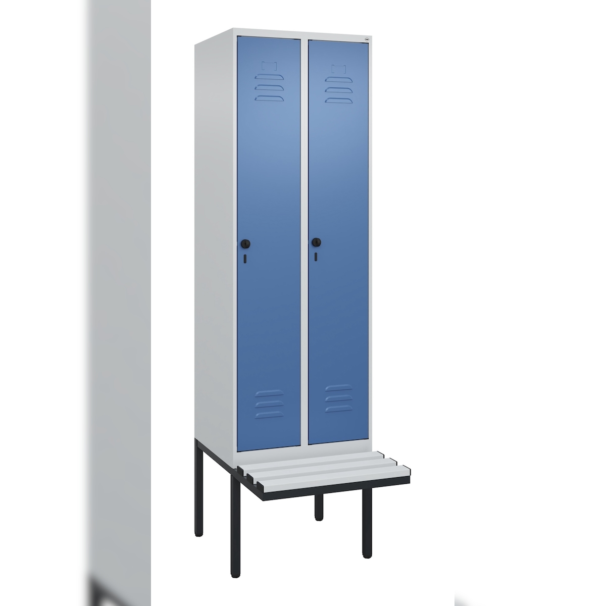 C+P Spind Classic PLUS, Kunststoff schwebende Sitzbank, 2 Abteile, HxBxT 212x60x82cm, Sicherheitsdrehriegel, Hellgrau/Fernblau von PROREGAL