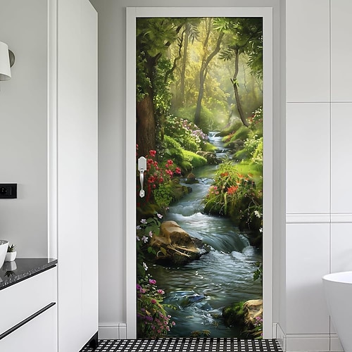 Striscione per porta con prato primaverile, natura, paesaggio, arazzo da parete, papaveri rossi, ruscello, foresta, raggi di sole, arte murale per ingresso, camera da letto, arredamento per la casa