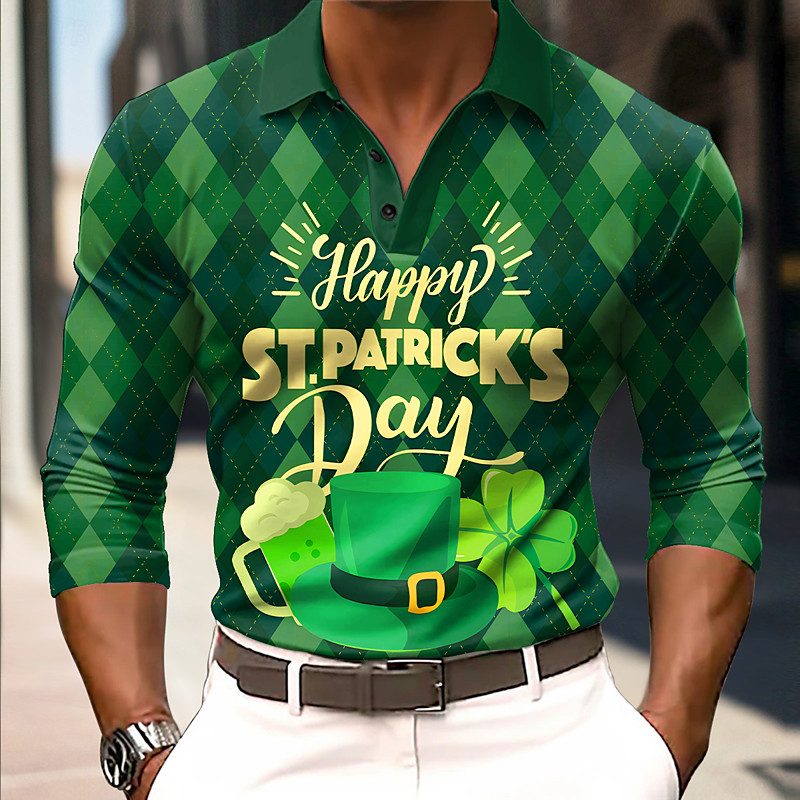 St Patrick's Day Men's Four Leaf Clover Hat Polo Long Sleeve Polo Shirts Lapel Casual Outdoor Street Athleisure Daily Wear 3D Print Buttons Spring Fall Black White Green
