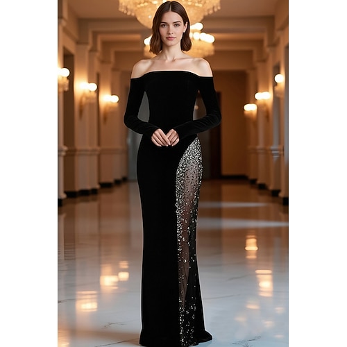 Abito a tubino colonna lungo fino al pavimento abito da sera elegante maniche lunghe scollato spalla abito da sera matrimonio con cristalli e perline