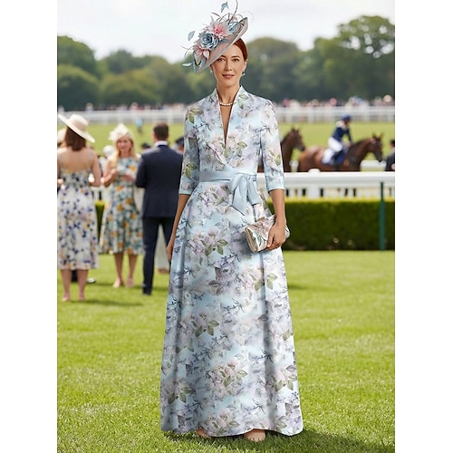 Linea ad A Lunghezza Tè Abito Camicia Abito da sera Abito da cerimonia per signora Manica 3/4 Colletto a Camicia Elegante Vintage Formale Ospite di nozze Derby del Kentucky Raso con Stampa floreale