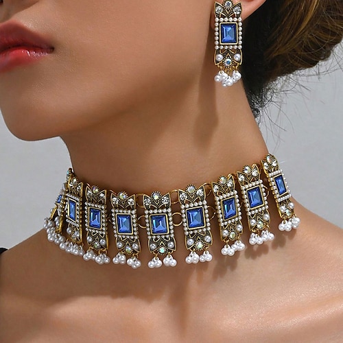 collana di gemme in lega in stile etnico orecchini 2 pezzi retrò industria pesante perla frangia testa gioielli