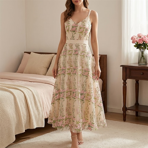 Elegante Vintage Anni 1950 Midi Vestito Canotta Ricamato Floreale Linea ad A Aderente Svasato Scollo a V Costume Per donna Casuale Tè Adulti Vestito Primavera Estate