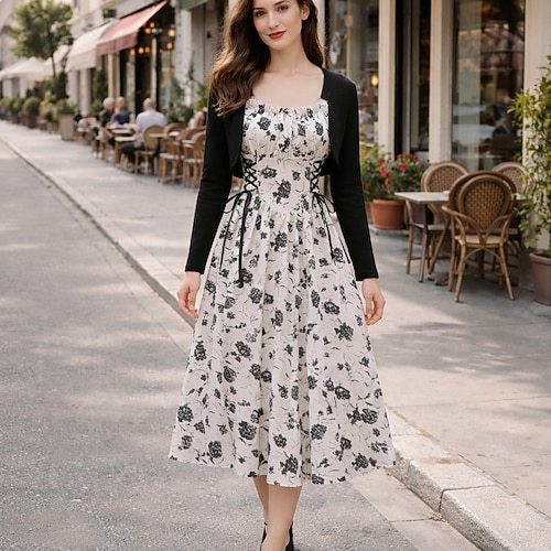 Elegante Anni 1950 Midi Vestito Cardigan Senza maniche Floreale Linea ad A Girocollo Costume Per donna Feste Abbigliamento Quotidiano Casual Quotidiano Adulti Top Vestito Primavera Estate