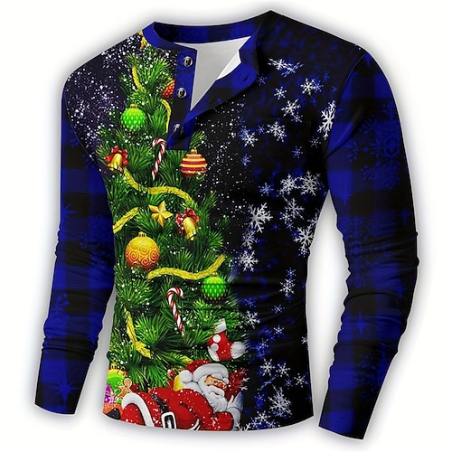 Weihnachten Herren Weihnachtsbaum Henley T-Shirt kariert Weihnachtsmann Baum Mode Alltag Casual 3D Print Henley Casual Urlaub Ausgehen Blau Rotamp;weiß dunkelblau langarm henley frühlingamp; fallen