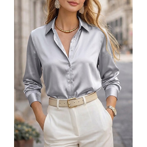 Per donna Camicia Top in raso Blusa Top Eleganti Arricciato Bottoni Drappeggiato Tinta unica Semplice Elegante Vintage Signore Manica Lunga Colletto a Camicia Top Regolari Quotidiano Ufficio Lavoro
