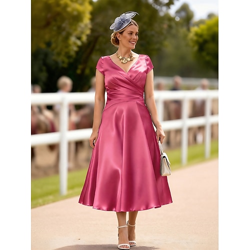 Linea ad A Lunghezza Tè Vestito da Festa Abito da Cocktail Abito da invitata a nozze Abito da cerimonia per signora Manica Corta Scollo a V Elegante Semplice Raso con Tinta unita