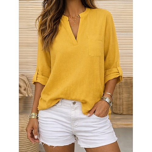 Per donna Camicie di cotone e lino Top estivi Blusa Top Eleganti Arricciato Patchwork Tasca Tinta unica Semplice Elegante Vintage Signore Manica 3/4 Scollo a V Colletto a Camicia Top lunghi Casuale
