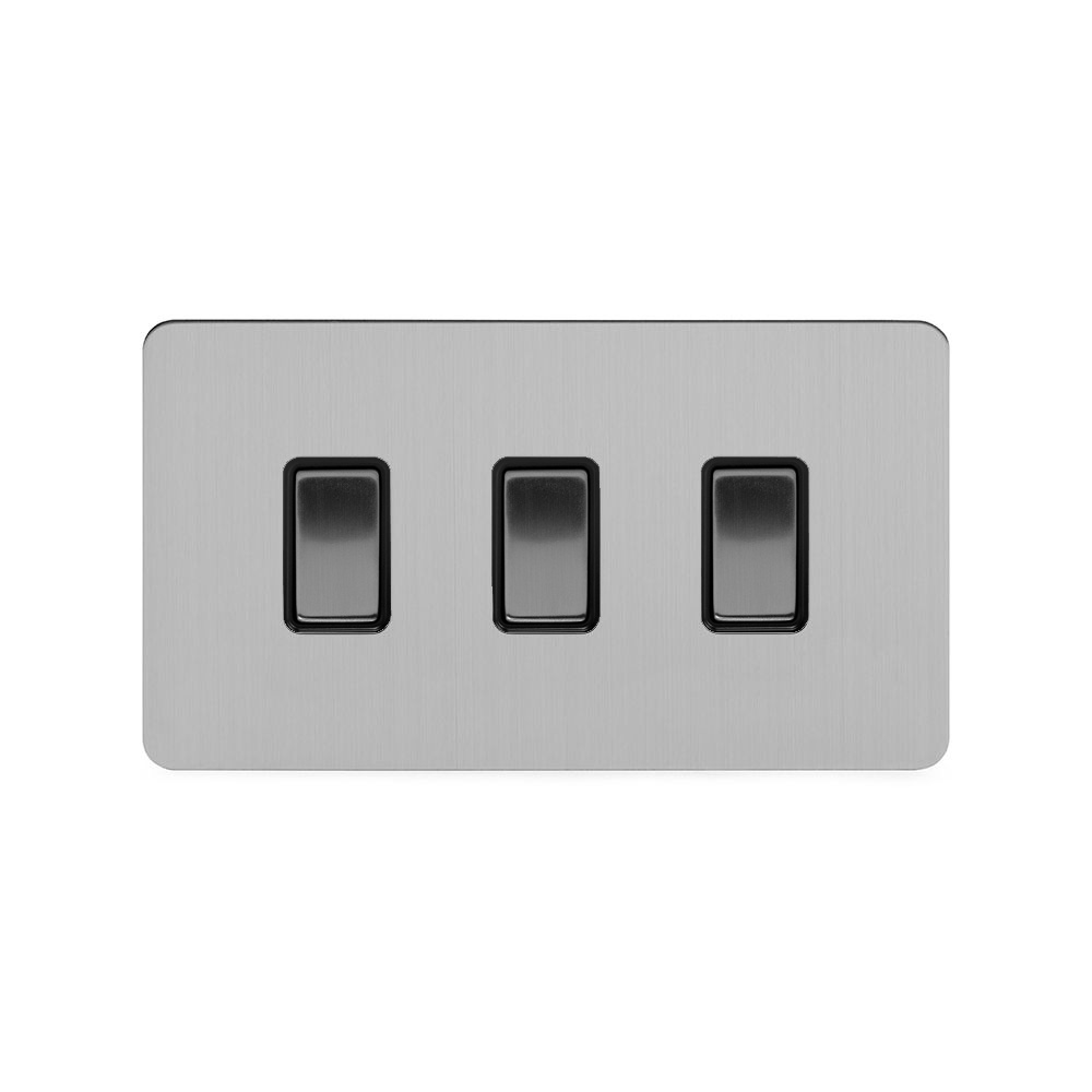 Soho Lighting Brushed Chrome Flat Plate 10A 3 Gang Switch on Double Plate 2 Way Blk Ins 2 Way Screwless - Size: H 86mm X W 146mm