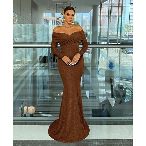 Abito da sera sirena trombetta in tessuto lurex stretch elegante formale lungo fino al pavimento con maniche lunghe scollato con plissettature glitter