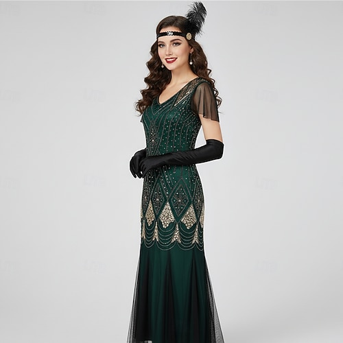 Set Retrò Vintage Anni Ruggenti Anni 1920 Lunghezza al pavimento Abiti Set di accessori Abito da sera con accessori Maniche corte Il grande Gatsby Invitato al matrimonio Paillettes Paillettes Scollo