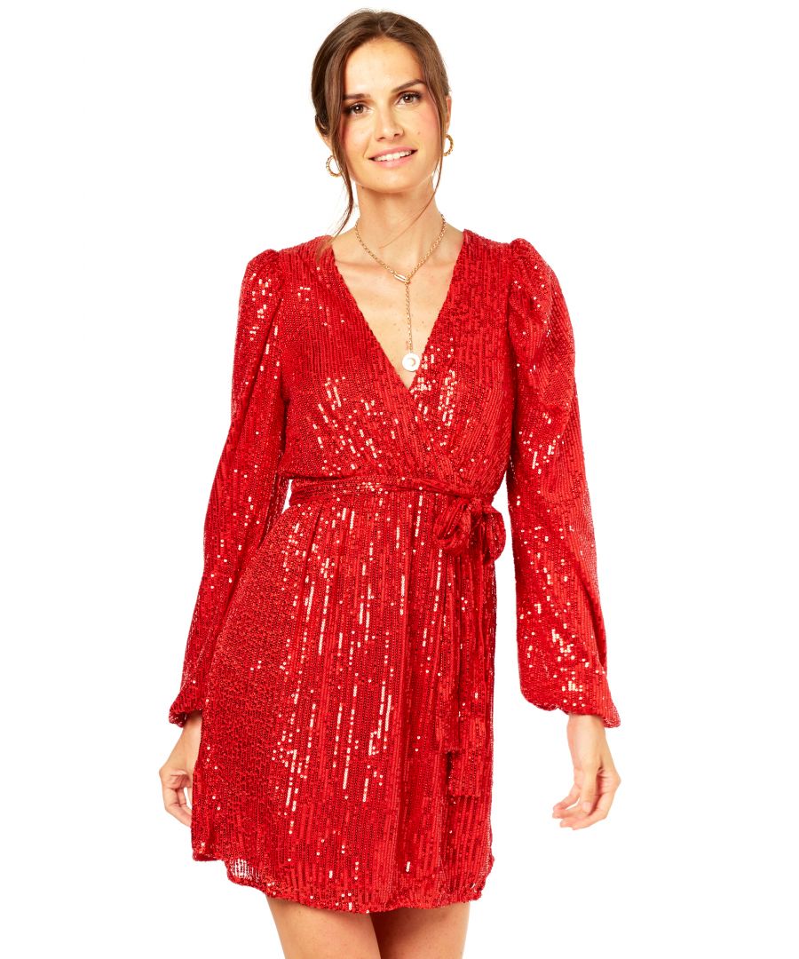Gini London Womens Bright Red Sequin V Neck Belted Mini Dress - Size 14 UK | Gini London Sale | Discount Designer Brands