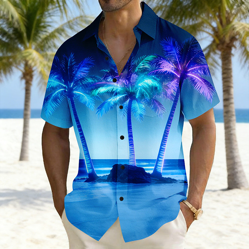 Men's Coconut Tree Landscape Tropical Plants Shirt Hawaiian Shirt Aloha Shirt Short Sleeve Hawaiian Vacation Holiday Summer Turndown 3D Print Front One Pocket Linen Like Shirt Red Purple Green Dark