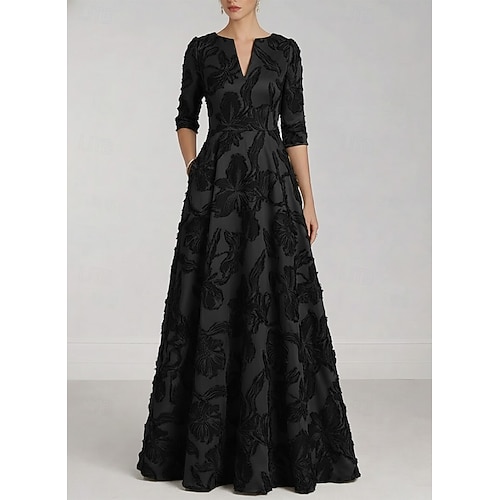 Linea ad A Lunghezza al pavimento Abito da Sera Elegante Floreale Manica 3/4 Scollo a V Matrimonio Formale Jacquard con Tasca