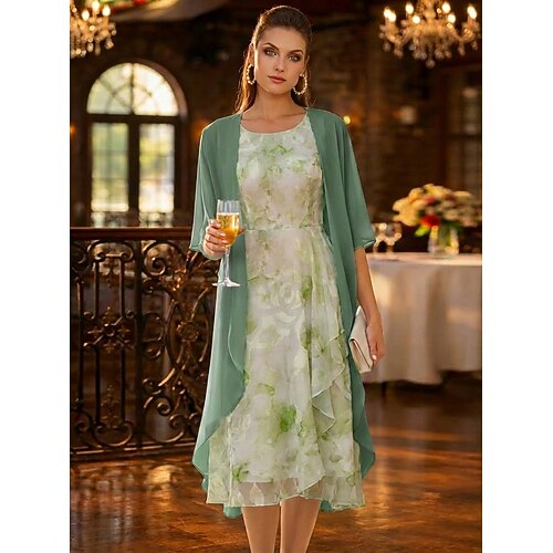 Due Pezzi Linea ad A Lunghezza Tè Abito da invitata a nozze Abito da cerimonia per signora Senza Maniche Manica 3/4 Girocollo Elegante Semplice Minimalista Formale Semi-Formale Chiffon Jacquard con