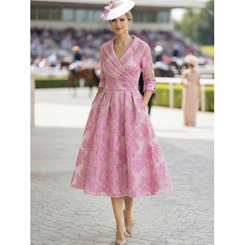 Linea ad A Lunghezza Tè Abito da Cocktail Abito da invitata a nozze Abito da cerimonia per signora Manica 3/4 Scollo a V Elegante Vintage Semplice Formale Jacquard con Pieghe