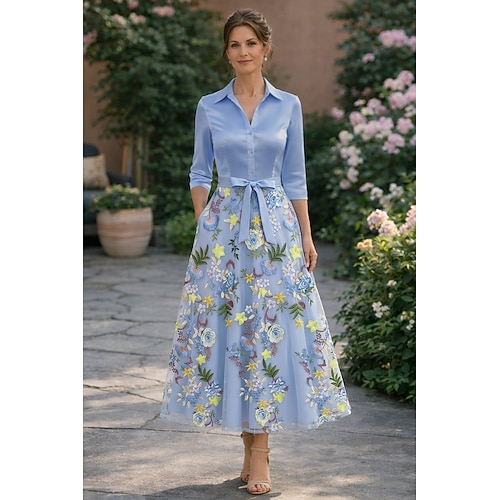 Linea ad A Abito Lunghezza alla caviglia Abito da invitata a nozze Abito da cerimonia per signora Manica 3/4 Colletto a Camicia Elegante Formale Ospite di nozze Derby del Kentucky Raso Pizzo con