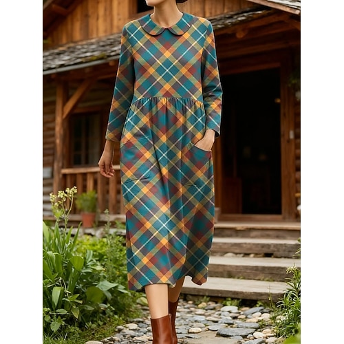Per donna Abito Midi Tubino Abito Pieghettato Vacanza Casual Boho Ferie Abito Primaverile Vestibilità regolare Plaid Manica Lunga Girocollo Blu Rosso Azzurro cielo Arancione Primavera Autunno