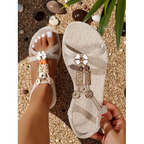 sandali bassi boho chic da donna con perline decorative in metallo: calzature comode per matrimoni casual e in spiaggia, eventi estivi e vacanze